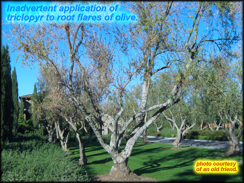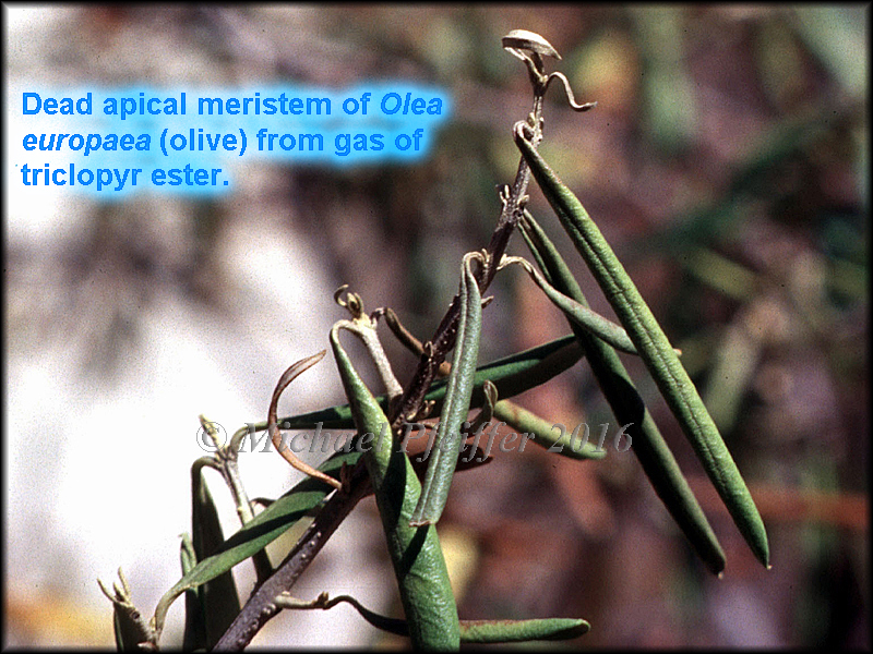 | Symptoms on plants includes downward twisting of petioles, wilting, leaf drop, stunting, yellowing of foliage, death of growing points, cracks in the bark of woody plants, leaves may appear crinkled/rough, cupped, strapped and have pointed tips. Fruit may be misshapen and maturity of plants and fruits delayed. |